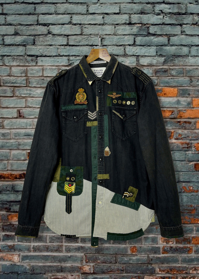 A luxurious, vintage collection embodying the true flavour of Fields Of Gold Deluxe. This western denim shirt in asymmetric colour block & stunning military inspired decorations is designed to remain with you through thick & thin. Come what may, you are always destined to be a victor. Go solo or wear it open over a tee. Feels as good as it looks!