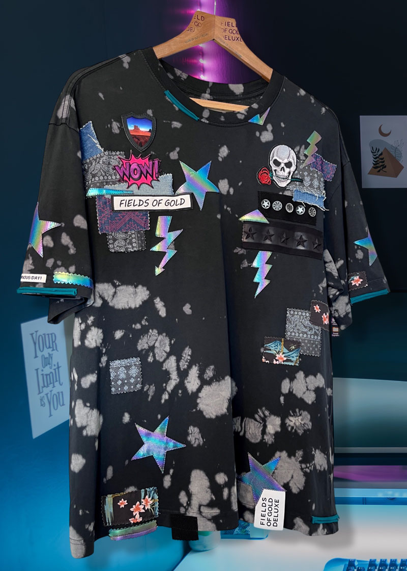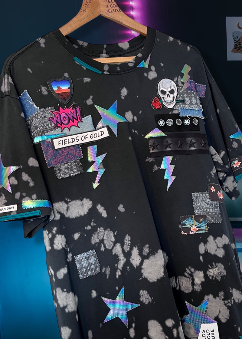 This collection with unconventional soul is an old-fashioned trip that doesn’t revolve around the stops but the ride itself. An exceptional journey of creativity, imagination and experimentation. This unique Tie & Dye T-Shirt adorned with whimsical elements features holographic stars with lighting symbols, denim patches, embroidered skull, deluxe badges and tapes. Fields Of Gold Deluxe signature labels complete the look. Feels even better than it looks!