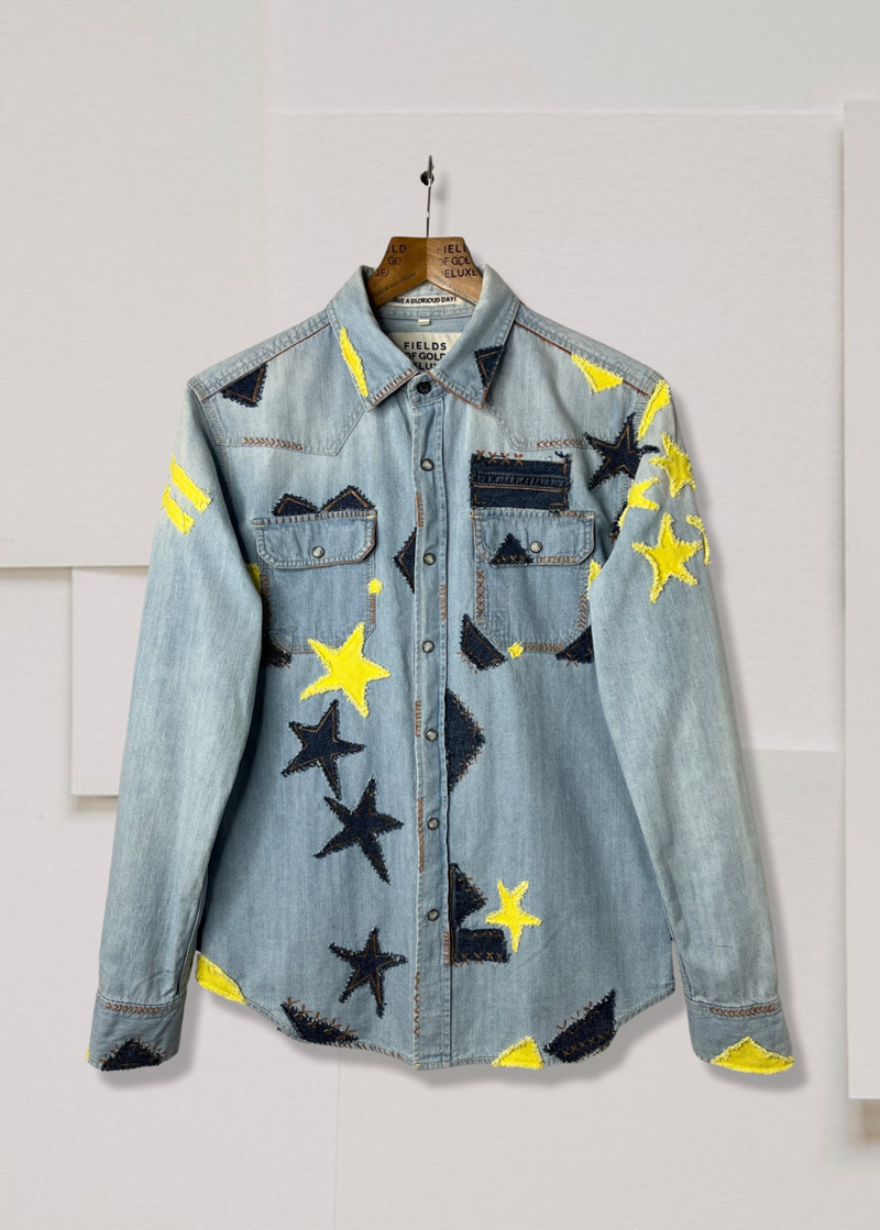 A unique, timeless collection embodying the true essence of Fields Of Gold Deluxe is designed to remain with you forever, through thick & thin. This stunning denim on denim raw patchwork shirt in vintage wash & copper decorations is truly a handcrafted masterpiece. A unique design to be cherished forever. Go solo or wear it open over a tee. Feels as good as it looks!